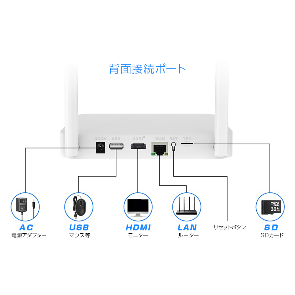 電源 12V 3A 消費電力 0.7W 内蔵HDD 1TB(SATA) モニター 10インチ 最大接続台数 10台 録画モード 常時録画、イベント録画(動体検知) 解像度 800万 対応ストレージ microSDカード、HDD バックアップ USB 再生速度 最大8倍速 入力/出力 HDMI端子 / USB端子 / LAN端子 モニター出力 HDMI HDMI出力解像度 1280x1024, 1440x900, 1080P, 4K@30Hz