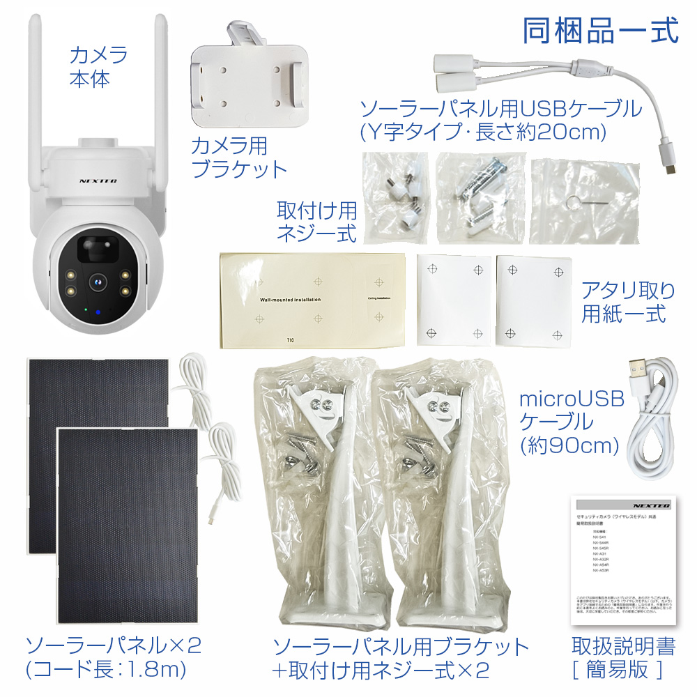 ソーラーパネル:長さ約240mm × 横幅約175mm質量 本体:約691g|ソーラーパネル(1枚/コード含む):約296g 付属品 カメラ本体×1、カメラ用ブラケット×1、ソーラーパネル×2