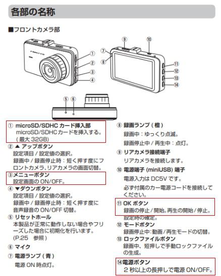 | 付属品 | フロントカメラ用取付けステー×1 フロントカメラステー用両面テープ×1 リアカメラ(ケーブル長:約0.5m)×1 リアカメラ接続ケーブル(ケーブル長:約5.4m) リアカメラ用両面テープ×1 カー電源コード(コード長:約3.5m)×1 microSDHCカード(8GB)×1 取扱説明書(保証書付)×1 |